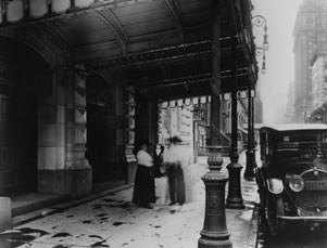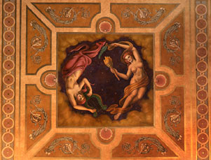 The Shubert and Booth theatres utilized an unusual design scheme, sharing an architecturally unified exterior (in the style of the “Venetian Renaissance”), but completely distinct interiors. The sgraffito (plaster frescoes created by etching plaster while it is still wet) that decorates the exterior was architect Henry B. Herts’s unusual decorative solution to a statute in the city’s building code dictating that no part of the edifice project beyond the building line. Another distinctive feature is the private roadway connecting 44th and 45th Streets, which runs between the two new theatres and the rear of the adjacent building--formerly the Astor Hotel, now the Minskoff. This thoroughfare, which came to be called Shubert Alley, allowed each theatre to occupy a corner lot. The Shubert's elegant interior is marked by elaborate plasterwork, and a series of theatrically-themed painted panels that adorn the boxes, the area above the proscenium arch, and the ceiling. Lee chose to build an office/apartment above the theatre, which is now the location of the Shubert Organization’s executive offices.