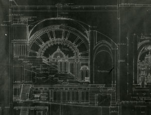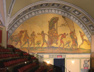 Herbert J. Krapp designed the Jacobs and the other theatres in this complex under the unifying theme of “modern Spanish style.” The theatre's interior features a groin-vaulted ceiling supported on either side by archways decorated with two murals entitled "Lovers of Spain," by Willy Pogany.
