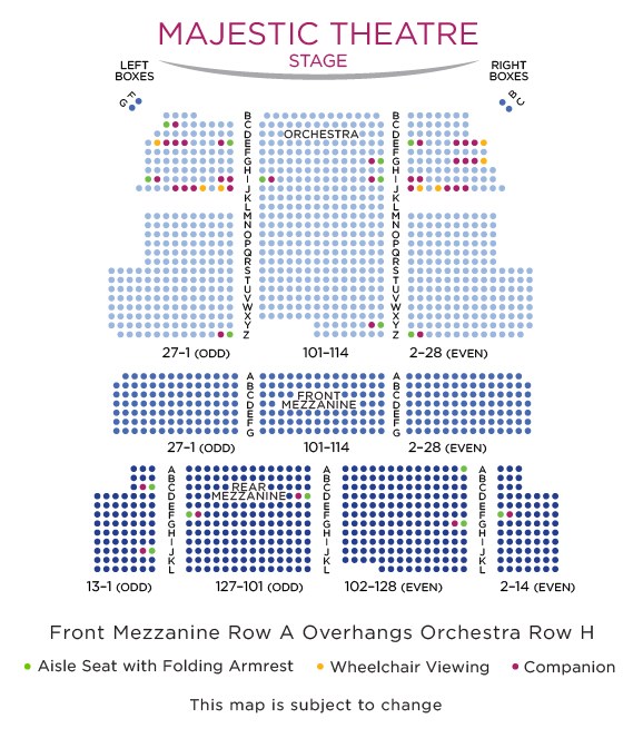The Majestic Theatre provides accommodations for patrons who are blind, deaf, partially sighted, and/or have hearing loss. The theatre provides infrared assistive listening devices for every performance at the theatre. In addition, beginning four weeks after a show’s official opening night performance, hand-held audio description devices, hand-held captioning devices, and unlimited access to downloadable audio description and/or captioning for personal mobile devices are all available free of charge. Prior thereto, we offer live-caption via CART using a hand-held device, upon request with two-weeks’ advance notice. For assistance, or If you have questions, contact Shubert Audience Services at 212-944-3700 or audienceservices@shubertorg.com. There is also a representative at the Shubert Audience Services kiosk at every performance to assist any patron with any of our devices, software, or technology. Hand-held devices are limited, although additional devices can be obtained with at least twenty-four hours’ notice.